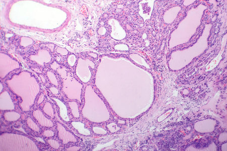 Photomicrograph of an endemic goiter tissue sample under a microscope, revealing thyroid gland abnormalities, including thyroid follicular cell hyperplasia and colloid-filled follicles.