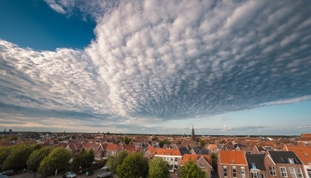 A stunning display of clouds paints the sky during sunset showcasing nature's beauty above a city.