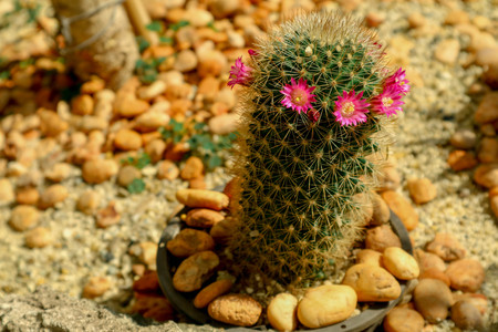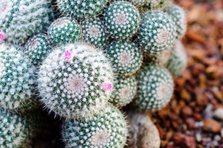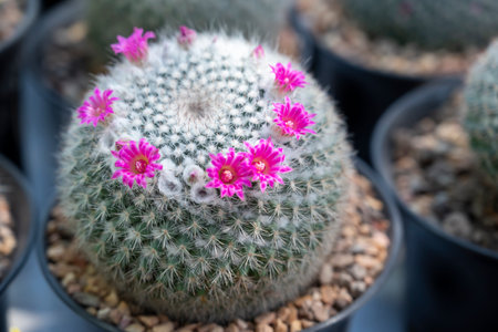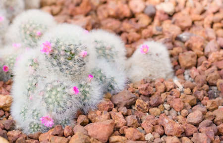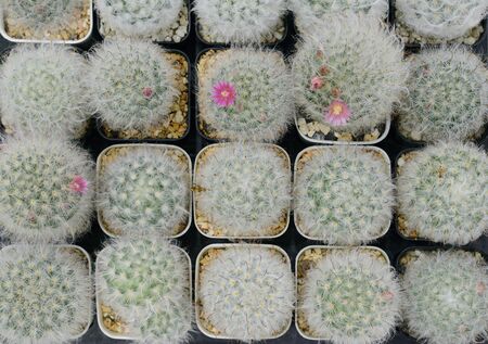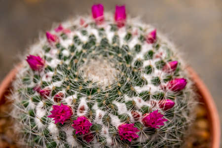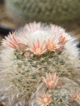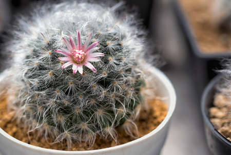 Mammillaria cactus with small pink flowers on top. A succulent cactus with round shapes and solitary or clustered stems densely covered with white spines. The Ornamental plant for decorating in the garden or home decor.