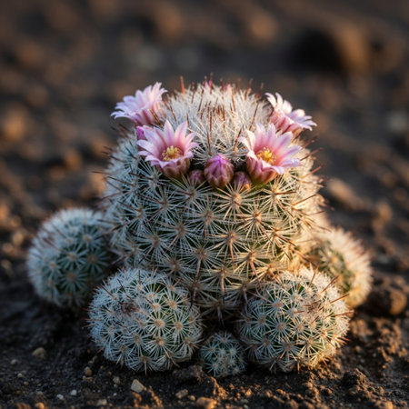 Mammillaria cactus with pink flowers in the desert.