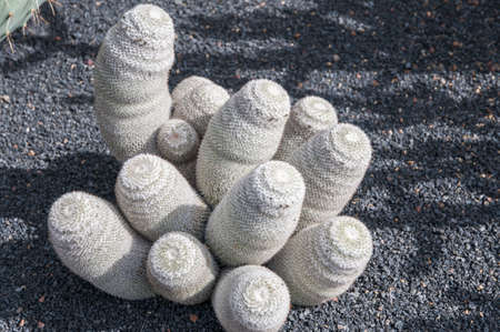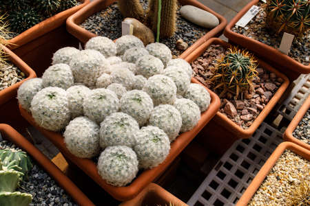 Close-up of Mammillaria candida cantus has a short white thorn around the tree.