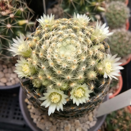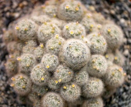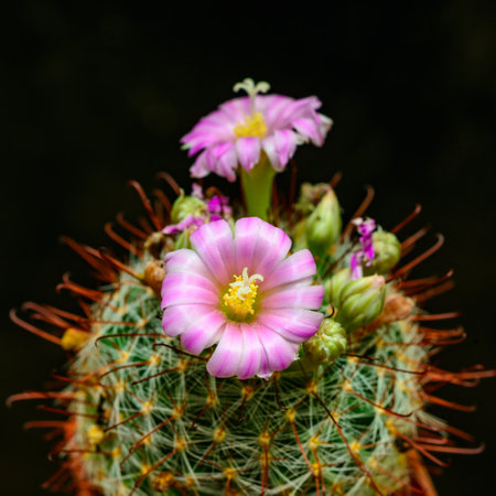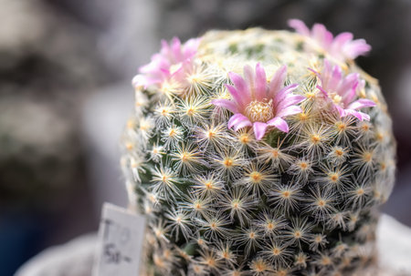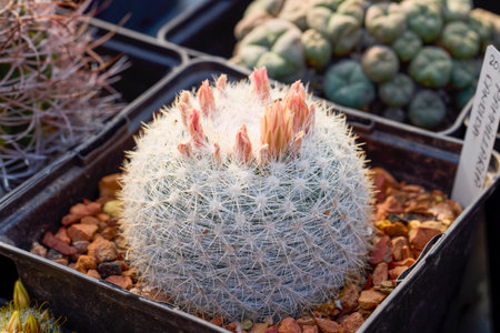 Flowering Mammillaria varieaculeata cactus in the botanical garden, Arid Plants.