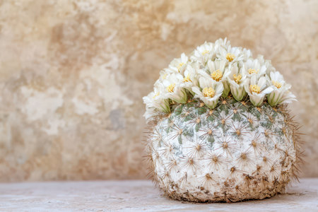 A round cactus displays vibrant white flowers atop its green surface set against a textured beige backdrop showcasing natural beauty.