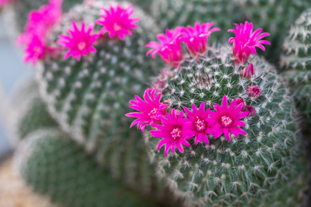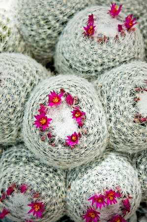 Close-up of pink flowers of cactus mammillaria blooming