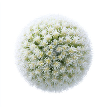 This captivating image showcases a round white cactus with delicate spiky blossoms, ideal for nature and botanical themes. The soft white background adds elegance.