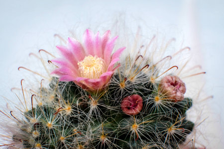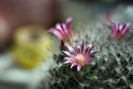 Mammillaria sp., close-up of a cactus blooming with pink flowers in spring
