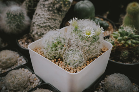 mammillaria cactus in a pot with white flowers. Close-up.