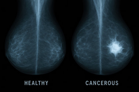 Side-by-side comparison showing healthy breast tissue on the left and cancerous tissue on the right, emphasizing contrast in structure and density.