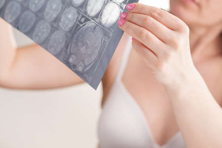Woman hand holding MRI brain film to see for diagnostic and report. Medical concept