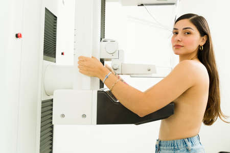 Concerned young woman getting a medical test to prevent breast cancer and promoting awareness to get early mammograms