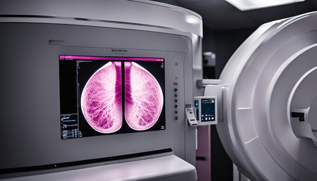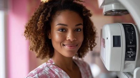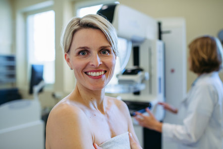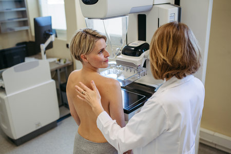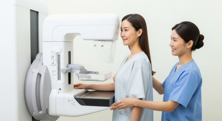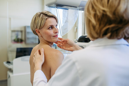 Female patient receiving mammogram support from healthcare provider in a clinical environment, highlighting the importance of women's health and early detection