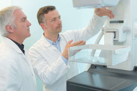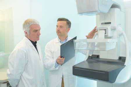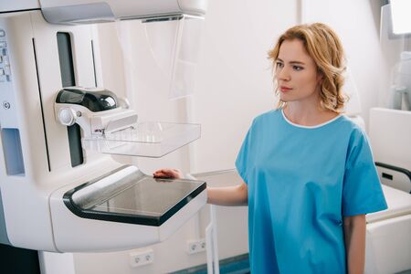 Attentive radiographer adjusting x-ray machine for mammography test while standing near patient