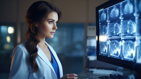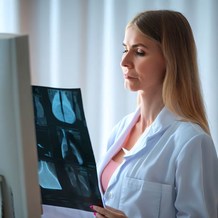 Doctor analyzing a mammogram x-ray on computer, supporting breast cancer awareness and early detection