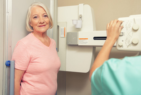 Experienced mammographer preparing woman for digital mammogram in clinic