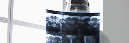 Doctor in protective suit holding x-ray picture in clinic. Diagnostics of pneumonia concept