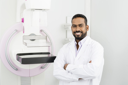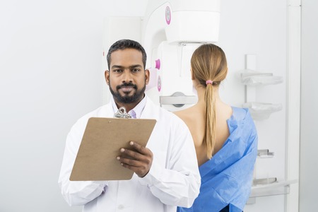 Smiling radiographer standing near x-ray machine and holding clipboard