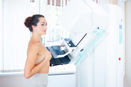 Young woman at breast cancer prevention screening at hospital. Hardware examination of the breast. Healthy young woman doing cancer prophylactic mammography scan. Modern hospital with hi-tech machine