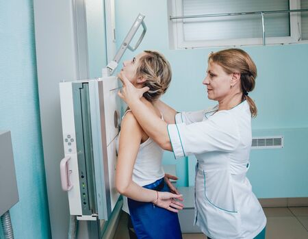 X-ray picture of a womans spine being taken after an vertebrae injury. Medical procedures, diagnosis, technology, patients, emergency and injury concept.
