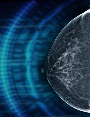 Digital mammogram or breast imaging scan isolated on black background with copy space. Medical illustration, cancer screening for women's health