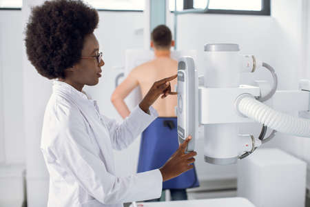 Female Aro American radiologist technician setting up machine to perform chest x-ray on male patient in modern radiology room at hospital