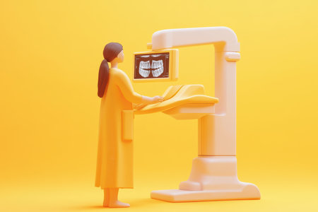A woman is standing in front of a dental x-ray machine. She is wearing a yellow coat and she is a dentist