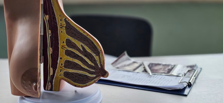 Detailed anatomical model of human breast used for educational purposes in a classroom setting