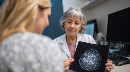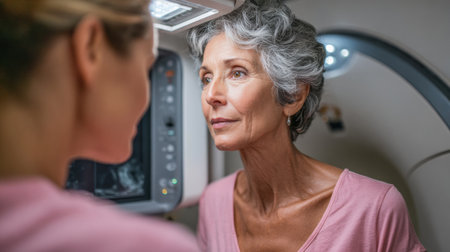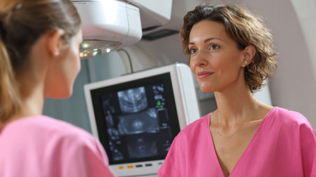 Two healthcare pros discuss breast cancer screening methods, highlighting mammograms, ultrasounds, and MRIs in a clinical setting.
