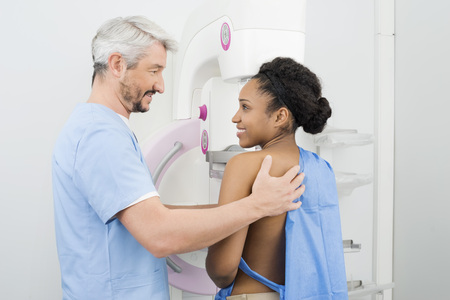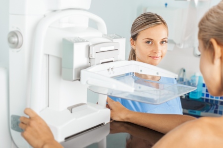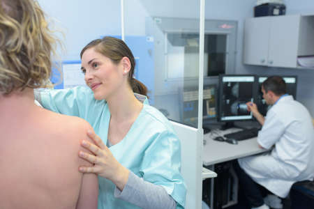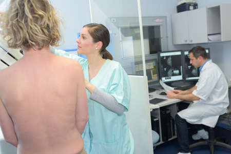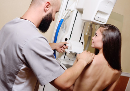 Professional radiologist doing mammogram x ray for young woman to check for breast cancer