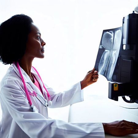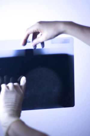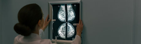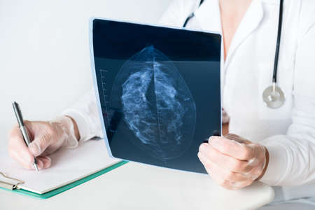 Female doctor looking at mammography results on x-ray.