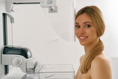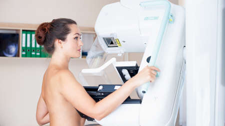 Young woman doing mammogram x ray for breast cancer prevention screening at modern hospital