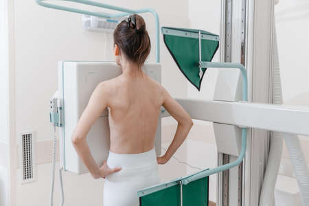 Hospital Radiology Room. Xray machine for fluorography. Woman patient scanning chest, heart or lungs in clinic office. Adult female undergoes healthcare exam. Medical X-ray equipment for radiography.