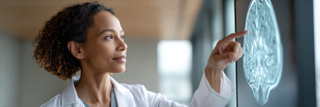 Medical professional examining holographic brain visualization on transparent digital interface, representing cutting edge neurological research and advanced healthcare technology