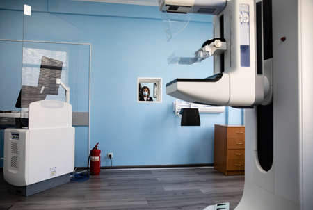 Hospital Radiology Room. Xray machine for fluorography. Woman patient scanning chest, heart or lungs in clinic office. Adult female undergoes healthcare exam. Medical X-ray equipment for radiography