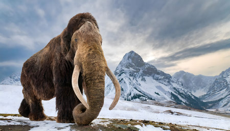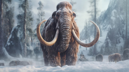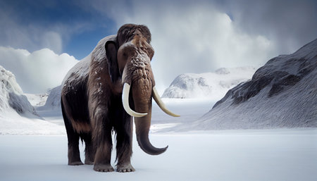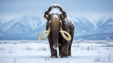 A mammoth with massive tusks stands amidst a snowy landscape with mountains in the background, reminiscent of a distant prehistoric past.