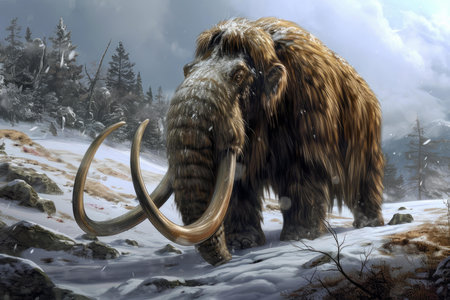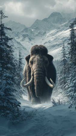 A woolly mammoth stands prominently in a snow-covered mountain landscape. The artwork displays a realistic style with detailed fur and ivory tusks, framed by snow-laden pine trees. The scene is illuminated with soft lighting, suggesting a cold, overcast environment suitable for various commercial and editorial applications.