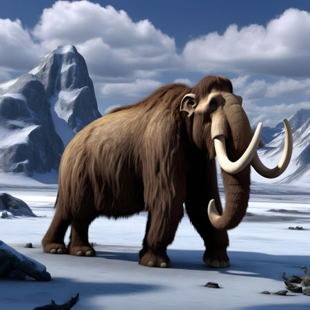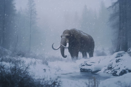 Digital artwork of an extinct woolly mammoth in a serene winter setting