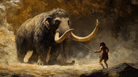 A caveman with a spear cautiously approaches a mammoth in a cave painting-style image, depicting the ancient hunt