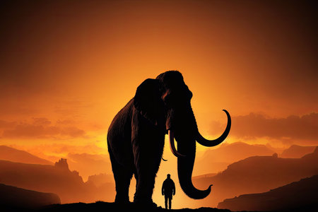 Silhouette Of A Mammoth And A Man Against A Sunset Back