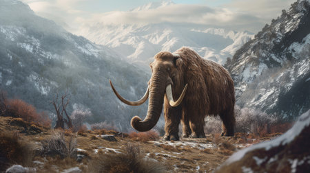 A furry old mammoth in snow with mountain landscape in the background. elephant mammoth. Generative ai
