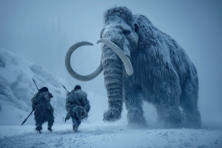 Two Neanderthal hunters dressed in animal skins advance through deep snow spears ready. They approach a formidable mammoth its massive form towering against a backdrop of primeval mountains.