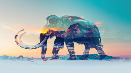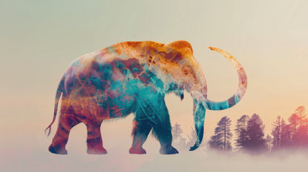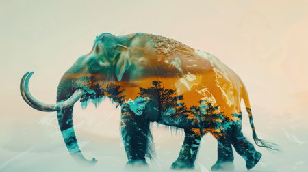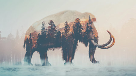 A digitally-created image depicting a woolly mammoth standing in a misty landscape, with a forest scene overlaid onto its body. The mammoth is in silhouette against a soft, pale background.