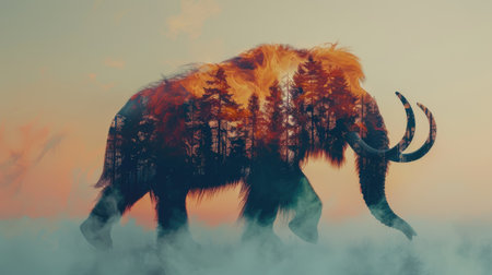 A digital illustration depicts a woolly mammoth silhouette against a misty sunrise backdrop, with an overlapping forest image blended into the mammoths form. The colors are warm and vibrant, and the overall effect is serene and awe-inspiring.
