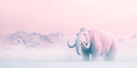 Woolly mammoth standing in a frosty pink hued arctic landscape with mist and snow covered mountains in the background at sunrise.