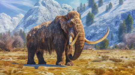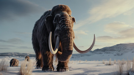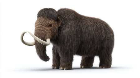 This 3D illustration showcases a woolly mammoth, emphasizing its thick fur and impressive curved tusks, representing prehistoric wildlife.