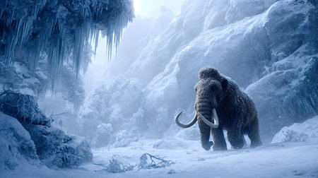 Woolly mammoth trekking through a cold, snowy, ice age landscape with frozen mountains and icicles, representing prehistoric life and extinct animals adapting to extreme winter conditions