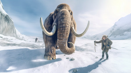 3D CG rendering of big mammoth and man in winter environment.