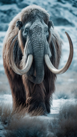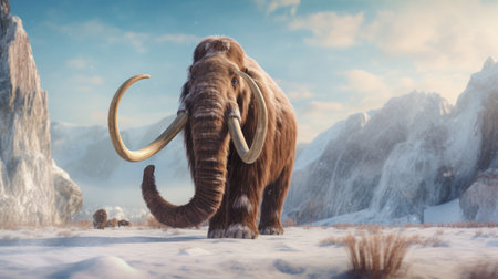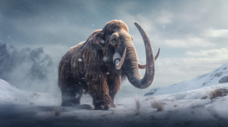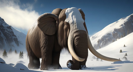 A mammoth with massive tusks stands amidst a snowy landscape with mountains in the background, reminiscent of a distant prehistoric past.