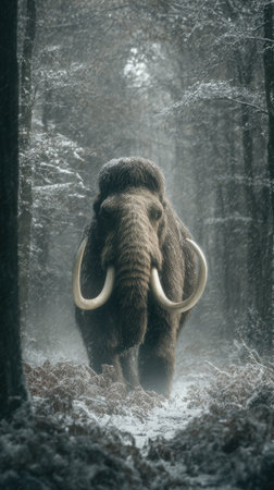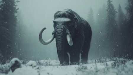 A large woolly mammoth stands in a snow-covered forest, its massive tusks prominent. The image displays muted tones, with the animal's fur and the surrounding trees creating a textured visual. The composition suggests a cold environment, hinting at a prehistoric scene suitable for various editorial and commercial applications.