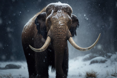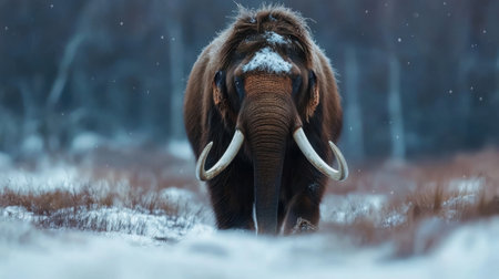 Woolly mammoth with large tusks standing full face in a snow-covered forest, living in the prehistoric ice age and representing ancient life and extinction concepts