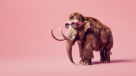 Mammoth wearing sunglasses on pink background, humorous animal concept